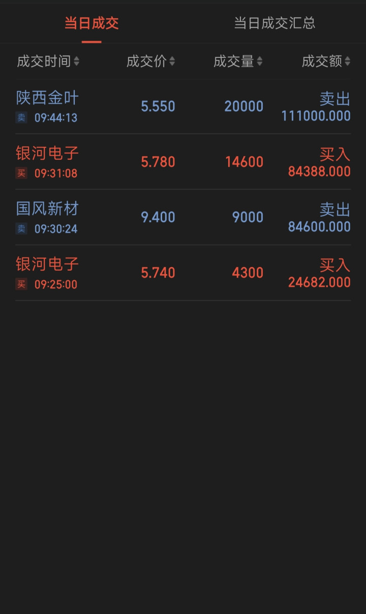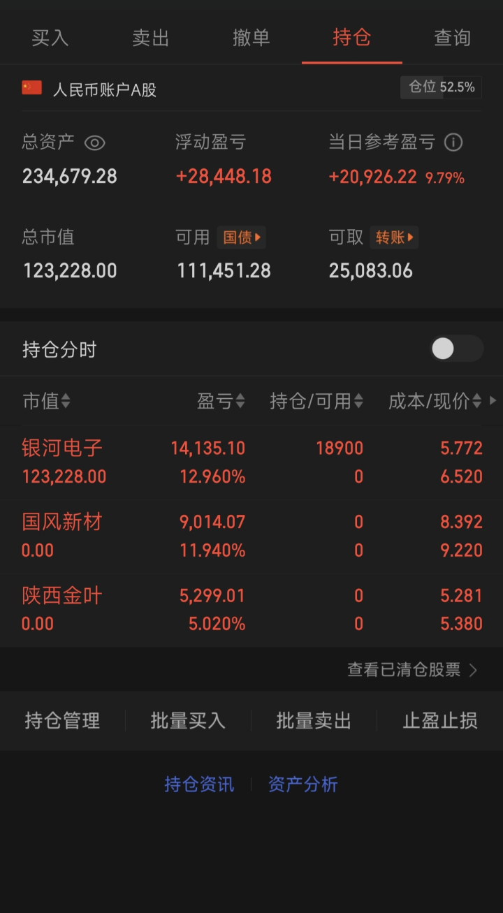 竞价下了一部分,因为剩的资金不多,主要都在国风新材和陕西金叶上。开盘后卖了国风新材,继续加的银河电子。